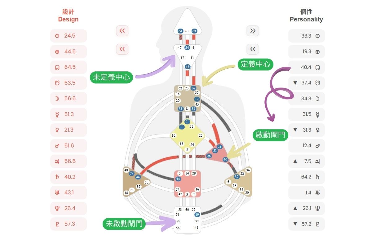 系統會以你出生當下的星象對接特定閘門;再往回推約 88 天,得到身體層(紅色)的啟動閘門。